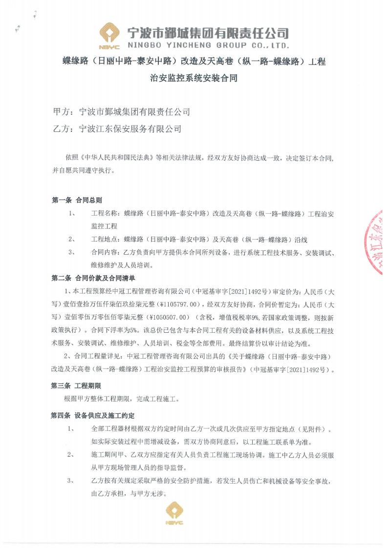 蝶緣路南起泰安中路,北至日麗中路,道路全長約700米,標(biāo)準(zhǔn)斷面寬度為28米;天高巷東起蝶緣路,西至縱一路,道路全長約160米,標(biāo)準(zhǔn)斷面寬度為16米,新建橋梁一座。項(xiàng)目總投資三千萬,鄞州保安公司承擔(dān)了其中治安監(jiān)控系統(tǒng)安裝部分。